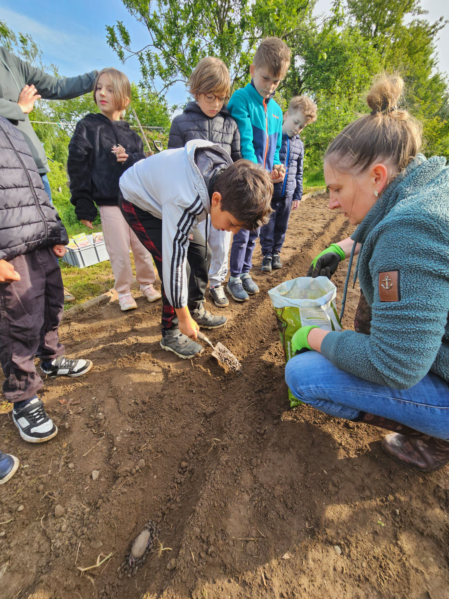 Im Mai wurden also die Kartoffeln gepflanzt. Die Kinder lernten dabei verschiedene Kartoffelarten kennen. Es wurden die Furchen gezogen und die Mutterknollen in die Erde gelegt. Danach mussten die Kartoffeln angehäufelt werden. Natürlich musste auch einmal Unkraut gejätet werden.